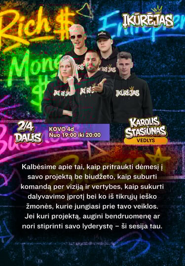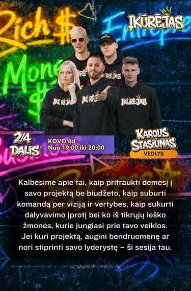 Mūsų renginiai turi labai lengvai virškinamus formatus. Pritaikyti aktyviems, ambicingiems, smalsiems žmonėms.